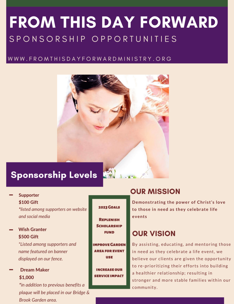 Are you apart of a small group? Mom’s club? Philanthropist group? Do you need a guest speaker for an event? We would love to share our story and how our incredibly unique organization is impacting the community! Please call us at 260-403-7323 or email us at info@fromthisdayforwardministry.org to schedule a speaking event!